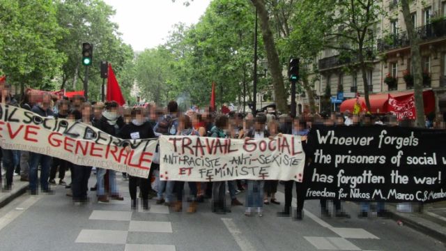 With our Banner we wanted to draw attention to all the prisoners who couldn`t fight by our side that day. For Example in Greece there is currently a trial going on against 22 Anarchists. Nikos Maziotis another Anarchist and Member of the group Revolutionary Struggle was life sentenced because he participated on armed struggle. Since the protests in France started three months ago, nearly 500 people were arrested by now. There are thousands of revolutionaries all over the world who are jailed because they fought for a free society.
