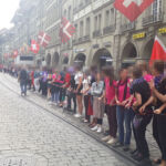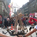 Unseren Aufrufen Menstruationsartikel für die Gassenarbeit und Gebäck für arbeitende Frauen* vorbeizubringen, stiess auf grossen Anklang. Des Weiteren zogen diverse Aktionsgruppen ganztägig durch Bern. So wurde u.a. das Medienhaus besucht, die Brunnen in der Stadt symbolisch rot gefärbt, Pflegebetriebe, sowie Kitas mit Gebäck und Flyern besucht, das Patriachat vor dem Bundesplatz zerstört und Strassen umbenannt. Vor den offiziellen Demonstrationen zogen wir mit rund vorwiegend 500-600 FLINT-Personen aus der Lorraine los. In der Innenstadt schlossen sich zeitweise bis zu 1000 Menschen dem anarchistischen Block an. Der Abschluss des Tages bildete die Demonstration gegen das Patriarchat am Abend, wo wir erneut von der Lorraine durch die Stadt zogen und u.a. durch die Aarbergergasse gingen, wo häufig sexuelle Übergriffe geschehen.